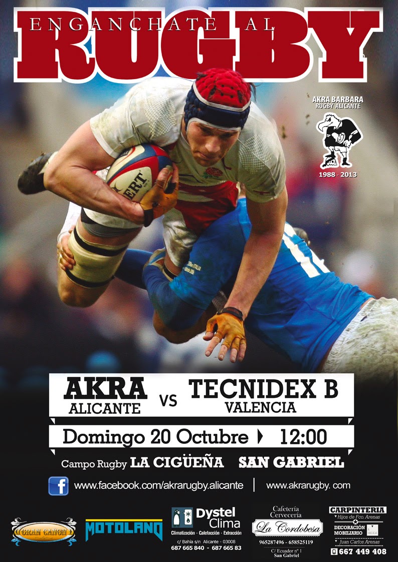 22/10/2013Y llego el día… después del partido de presentación del pasado día 5 donde los Buitres dejaron a la afición con un sabor amargo al caer contra La Vila R.C. El próximo domingo día 20, el Akra Barbara R.C se estrena contra el Tecnidex Valencia R.C “B”. El encuentro se celebrará a las 12:00 de la mañana en el Campo de Rugby de la Cigüeña, donde todos esperamos conseguir los tan ansiados puntos que nos permitan estar y permanecer en los primeros puestos de la Clasificación desde el primer momento.