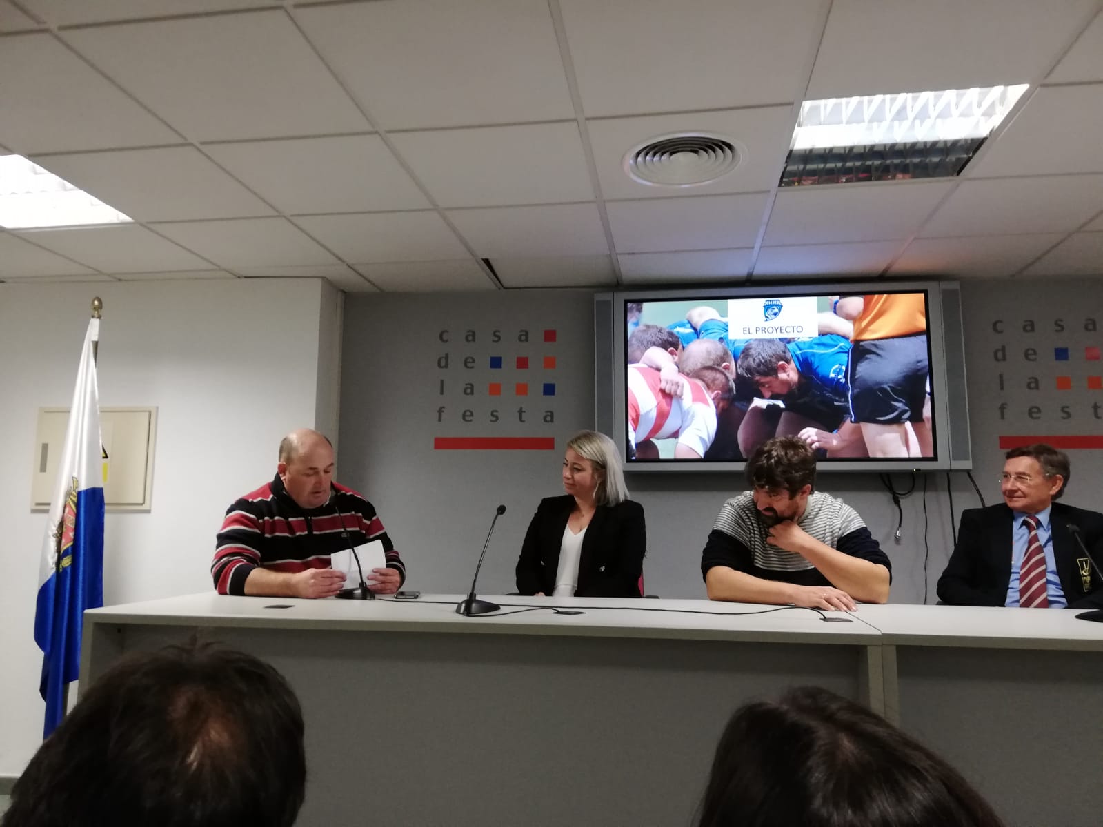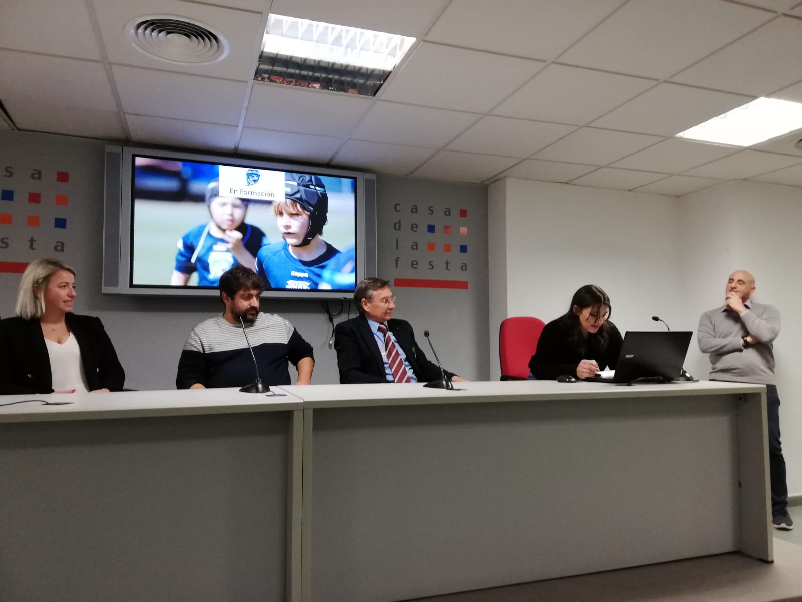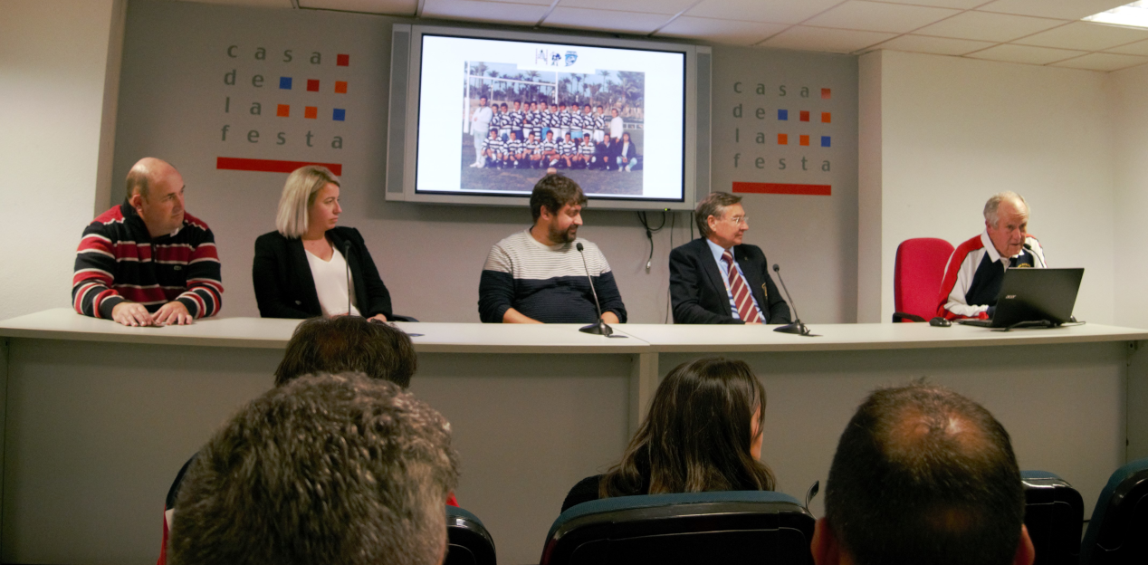 - Marisa Gallo Concejala de Deportes del Ayto. de Alicante, Manuel Cano presidente del AKRA y Jose Luis López Pérez de la Federación de Rugby de la Comunidad Valenciana en la presidencia atendiendo la ponencia de Antonio Huerta Fundador del AKRA